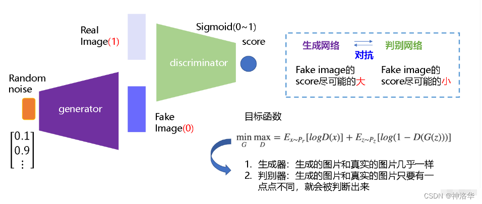 生成器G从给定噪声中(一般是指均匀分布或者正态分布)采样来合成数据,判别器D用于判别样本是真实样本还是G生成的样本。G的目标就是尽量生成真实的图片去欺骗判别网络D,使D犯错;而D的目标就是尽量把G生成的图片和真实的图片分别开来